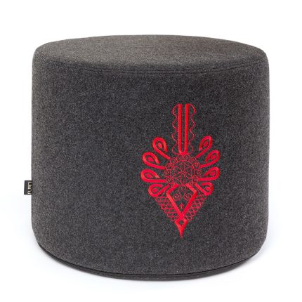 Pufy z kolekcji Folk zostały obite wysokiej jakości, odpornym na uszkodzenia i zabrudzenia, grafitowym lub szarym filcem. Połączenie prostej formy z filcowym materiałem a także dodanie haftu w postaci góralskiej parzenicy tworzy mebel, który doskonale odnajdzie się we wnętrzu domu z bali, domku letniskowego, czy nowoczesnej stodoły.