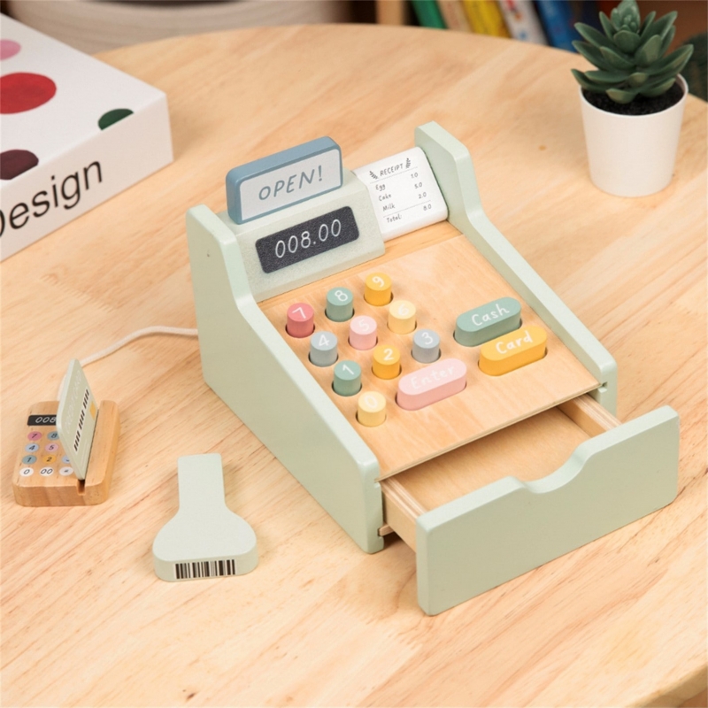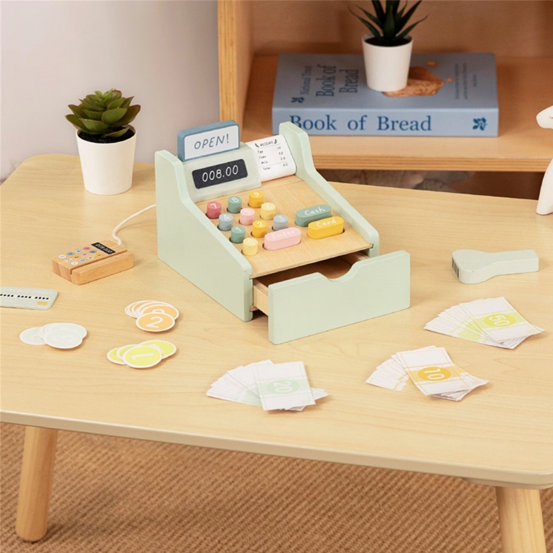 Pozwól swojemu dziecku zostać prawdziwym sklepikarzem dzięki tej uroczej drewnianej kasie fiskalnej ! To nie tylko pięknie wykonana zabawka w pastelowych kolorach, ale przede wszystkim brama do niezliczonych godzin kreatywnej zabawy. Zestaw wyposażony jest w wszystko, czego potrzeba do prowadzenia własnego sklepiku – od skanera kodów terminal płatniczy, kolorowych banknotów po monety i karty kredytowe. Każdy element został przemyślany tak, aby zabawa była realistyczna i rozwijająca, a dziecko mogło poczuć się jak dorosły podczas codziennych zakupów.
