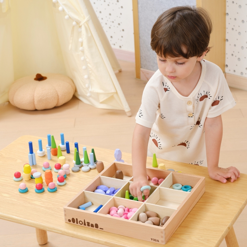 Klocki Nature Treasures VIGA to 141 luźnych elementów inspirowanych naturą – grzyby, plastry miodu, kamienie i stożki. Dzięki otwartej formie klocki nie narzucają zasad – dziecko może swobodnie sortować, budować i tworzyć własne historie. Zestaw wspiera rozwój manualny, koncentrację i wyobraźnię, będąc idealnym narzędziem do zabawy sensorycznej i artystycznej. To coś więcej niż zabawka – to inwestycja w rozwój Twojej pociechy!
