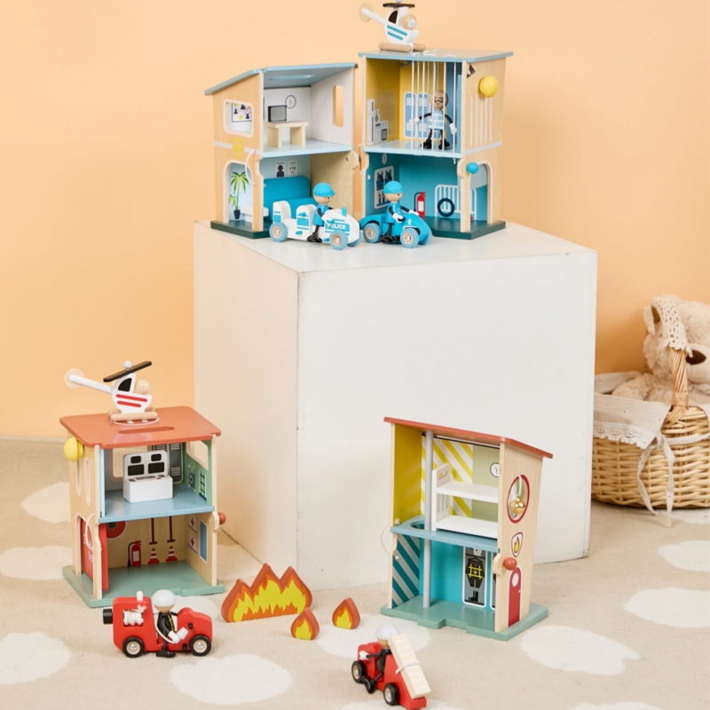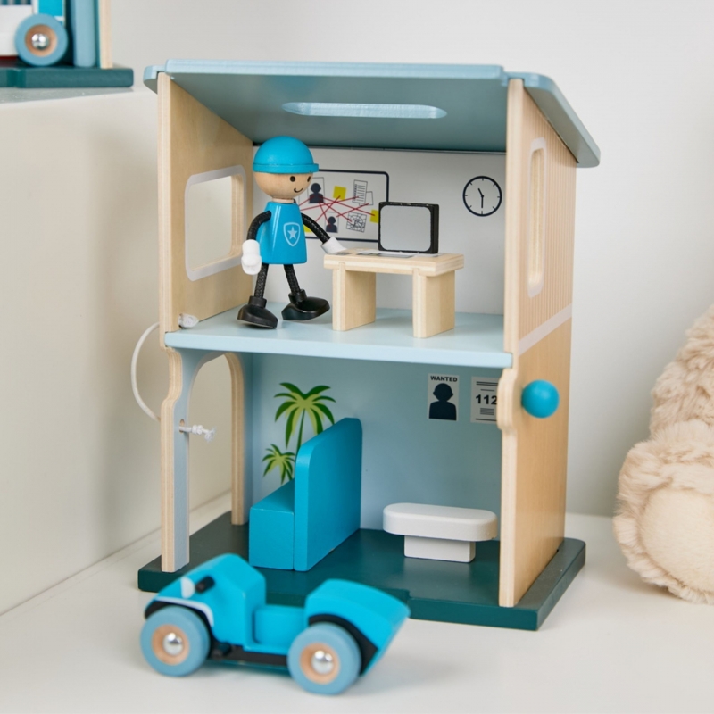 Posterunek Policji 12el. to kompletna zabawka, która pozwoli Twojemu dziecku wcielić się w rolę dzielnego policjanta i dbać o porządek w mieście! Wykonany z naturalnego drewna, ten zestaw zachwyca swoją jakością i dbałością o detale. Posterunek policji został zaprojektowany w Paryżu, co gwarantuje jego unikalny styl i funkcjonalność. Zawiera dwa budynki, z których jeden ma celę, a drugi wyposażony jest w pokój przesłuchań. Dzięki różnym konfiguracjom i otwartym drzwiom, dziecko może swobodnie manipulować elementami, tworząc własne scenariusze. Zabawka jest idealna do rozwijania wyobraźni, zdolności językowych oraz małej motoryki, zapewniając godziny kreatywnej zabawy.