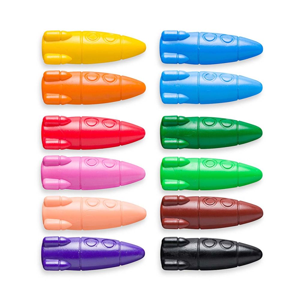 Zestaw 12 świecowych kredek w kształcie rakiet.