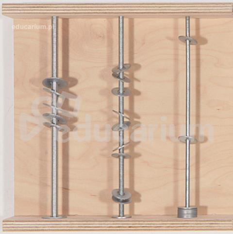 Zestaw trzech metalowych prętów z nanizanymi metalowymi nakładkami zamocowano na drewnianej tabliczce. Nakładki można obkręcać  lub podnosić do góry. Wprawione w ruch kręcą się i opadają, co pozwala skoncentrować wzrok i uwagę dziecka na tych drobnych elementach.