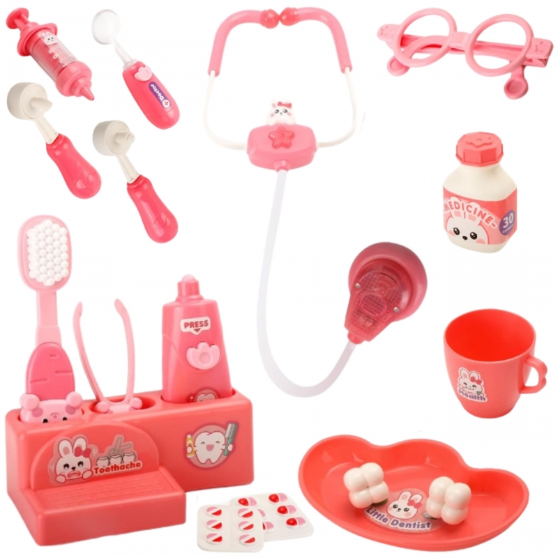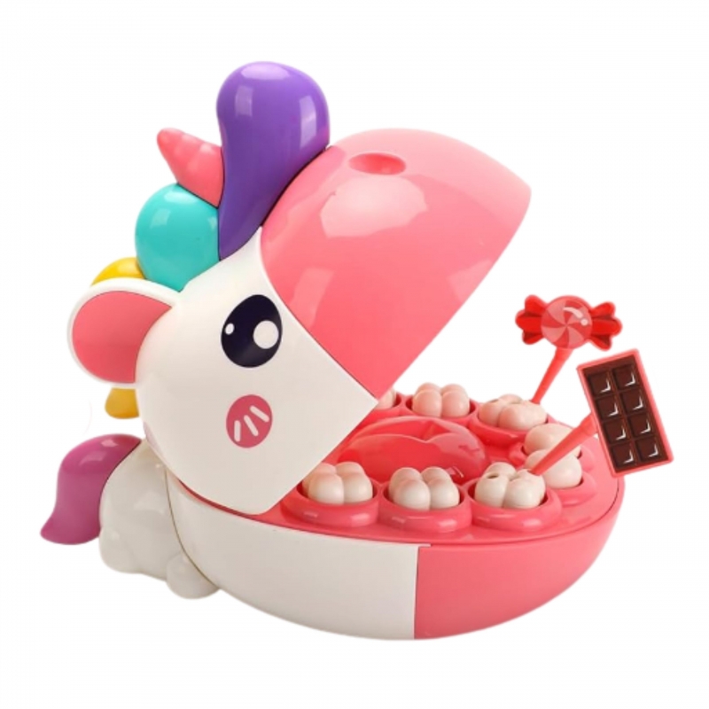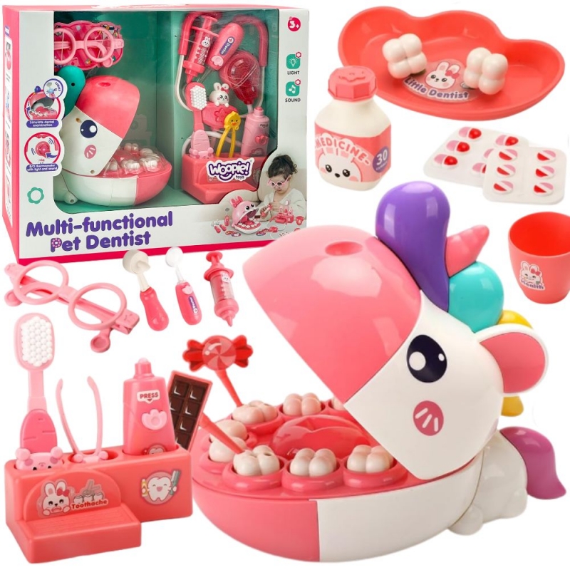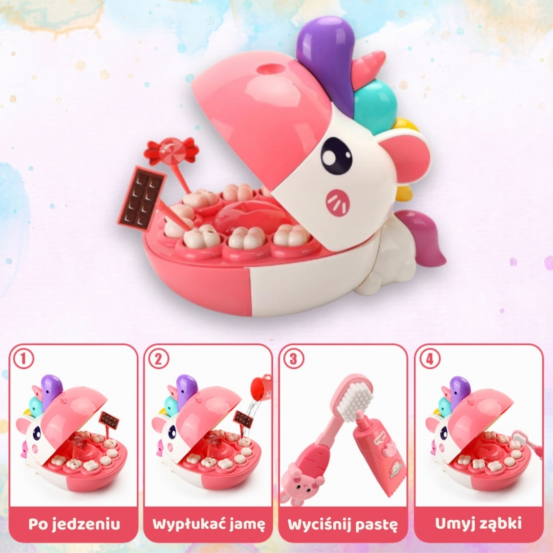 Zestaw małego dentysty głowa jednorożca to wyjątkowa zabawka edukacyjna, która wprowadza dzieci w świat medycyny i dbania o zdrowie jamy ustnej w sposób pełen radości i fantazji. Dzięki temu zestawowi maluch może wcielić się w rolę małego dentysty, przeprowadzać badania, leczyć ząbki pacjenta i uczyć się podstaw higieny w zabawny oraz bezpieczny sposób. Realistyczny kształt zębów i przyjazny wygląd kolorowego jednorożca sprawiają, że dziecko z zaciekawieniem odkrywa każdy element zabawy. Otwierana paszcza z zestawem zębów pozwala na symulację prawdziwego badania dentystycznego – maluch może zaglądać do środka, używać narzędzi i przeprowadzać „leczenie”. W zestawie znajduje się wszystko, co potrzebne do małej kliniki dentystycznej: lusterko, szczypce, strzykawka, szczoteczka do zębów, a także stetoskop z efektami świetlnymi i dźwiękowymi. Dziecko może wcielać się w rolę lekarza, pacjenta lub asystenta – dzięki czemu zabawa staje się dynamiczna, angażująca i pełna emocji. Zestaw został zaprojektowany tak, aby nie tylko bawić, ale i uczyć. Dziecko poznaje budowę jamy ustnej, dowiaduje się, dlaczego mycie zębów jest tak ważne, oraz jak unikać próchnicy. Zabawka pomaga także w oswojeniu lęku przed wizytą u dentysty, dzięki czemu późniejsze spotkania z prawdziwym lekarzem przebiegają spokojniej. Wszystkie elementy zostały wykonane z trwałych, bezpiecznych dla dzieci materiałów o gładkich, zaokrąglonych krawędziach. Całość utrzymana jest w estetycznej pastelowej kolorystyce, która przyciąga wzrok i zachęca do zabawy. Zestaw jest bogaty w detale i pozwala dziecku poczuć się jak prawdziwy dentysta. Wszystkie elementy są lekkie, łatwe do uchwycenia przez małe rączki i starannie dopasowane do wieku dziecka. Świetnie sprawdzi się zarówno w domu, jak i w przedszkolu jako pomoc edukacyjna.
