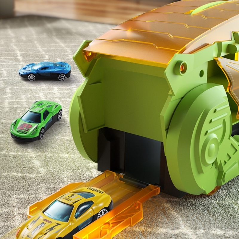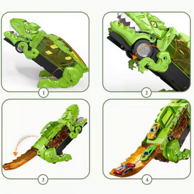Ten niesamowity Dinozaur Pożeracz z autkami  to prawdziwa gratka dla każdego małego miłośnika pojazdów i prehistorycznych stworzeń. Dinozaur-ciężarówka nie tylko mieści cały zestaw samochodzików w środku, ale pełni także funkcję interaktywnej zjeżdżalni i służy jako wygodna walizka z uchwytem . Po rozłożeniu zabawka zmienia się w tory wyścigowe, po których mogą pędzić dołączone samochodziki. Zestaw zawiera aż 12  małych pojazdów, dzięki czemu zabawa może trwać godzinami – solo lub z przyjaciółmi! Ruchome elementy, takie jak otwierana paszcza, łapy dinozaura czy opuszczana rampa, wprowadzają dodatkowy wymiar interaktywności, rozwijając przy tym zdolności manualne i wyobraźnię dziecka. Całość wykonana została z solidnego, bezpiecznego tworzywa, odpornego na intensywną zabawę. Dzięki możliwości składania i wygodnej rączce, zestaw świetnie sprawdzi się zarówno w domu, jak i w podróży. To idealna zabawka dla dzieci kochających pojazdy, dinozaury, a także kreatywne konstrukcje i dynamiczną rozgrywkę. Ten zestaw z pewnością stanie się ulubionym elementem dziecięcej kolekcji!